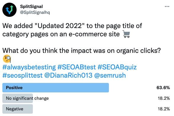 The web site in query has numerous recurrently up to date content material (product listings) on its class pages. We needed to validate whether or not including ‘up to date’ and the present yr (up to date 2022) to the title web page would have a optimistic impact on natural visitors to the class pages and if it will be thought-about a ‘contemporary content material’ sign for Google.